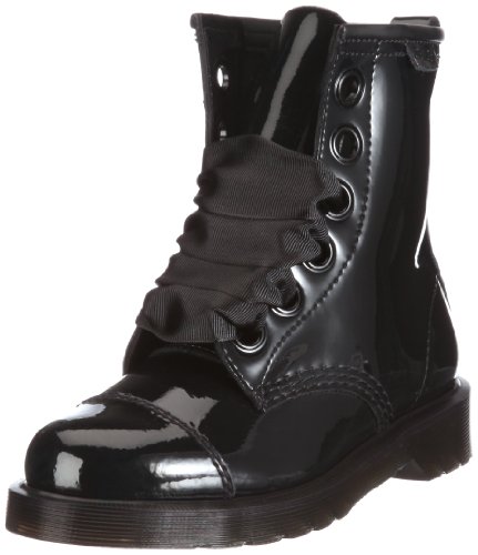 Look funky and fabulous in the Dr. Martens Grace Bow Capper Boot. Equipped with the classic silhouette of the 1460 boot, this cap-toe women's ankle boot goes the extra style mile with a patent leather upper, oversized, reinforced eyelets and interchangeable ribbon laces for feminine flair. Hidden Goodyear welt construction offers flexibility and weather-resistant durability in a clean, sleek package. The Dr. Martens Grace Bow Capper Boot has a cushioned footbed for supportive comfort and is finished with a signature air-cushioned PVC sole to keep you feeling as sprightly as you look. Air Cushion Sole. Approx. ¾'' platform height. Approx. 1¼'' heel height. Approx. 6'' boot shaft height. Approx. 9'' boot circumference. Back pull loop. Cushioned footbed. Heat sealed. Hidden Goodyear Welt Construction. Interchangeable black and polka-dot ribbon laces. Patent leather upper. PVC Sole. Six-eye lace closure with oversized eyelets. Slip- and abrasion-resistant. Synthetic lining. Z welt-stitch.